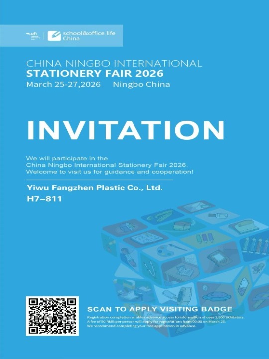 Yiwu Fangzhen Plastic Co., Ltd. is excited to announce its participation in the China Ningbo International Stationery Fair 2026, scheduled from March 25 to March 27, 2026, at Ningbo, China. As a leading company specializing in the production of high-quality plastic products, Yiwu Fangzhen Plastic looks forward to meeting clients and industry professionals at this prestigious event.